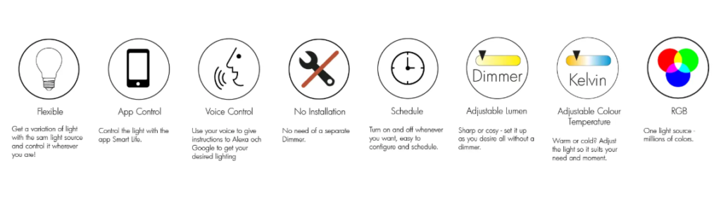 With our smart products, you can effortlessly control your lighting from anywhere. Turn lights on or off, adjust brightness, change colors, or set schedules—all with a tap on your smartphone. Wake up to a gentle glow, enjoy optimal lighting for work, and create a cozy ambiance in the evening, even with different colors. Easily managed through the Smart Life app or voice commands via Google Home or Alexa, Smart Light adapts to your needs and simplifies your daily life.